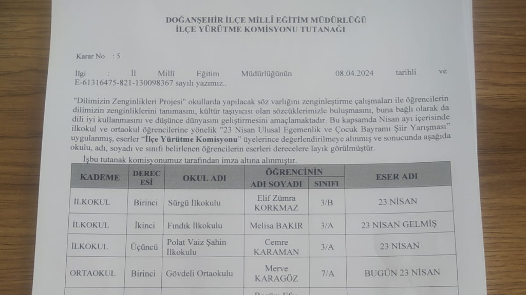 "Dilimizin Zenginlikleri Projesi" kapsamında 23 Nisan Ulusal Egemenlik ve Çocuk Bayramı konulu şiir yarışmasında okulumuz 3-B sınıfı öğrencisi Elif Zümra KORKMAZ ilçemizde birinci olmuştur. Kendisini tebrik ediyor, öğretmenine ve ailesine teşekkür ediyoruz...